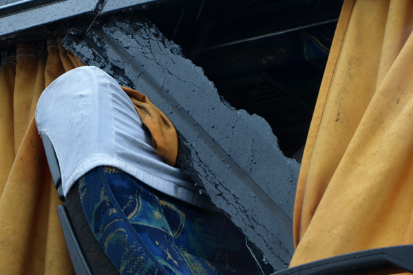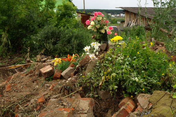 На месте ДТП две кучи мусора: большая совсем недавно была частным домом, сейчас ее венчают букеты цветов; та, что поменьше, состоит из деталей автобуса — треснувшее лобовое стекло, ремни безопасности, части переднего бампера аккуратно сложены на примятой траве.