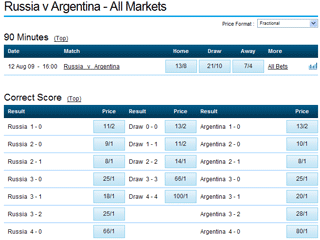 Россиян считают фаворитами матча авторитетные букмекерские конторы SkyBet и William Hill, а bet365 не отдает преимущества ни одной из команд. На бирже ставок Betfair ставки на победу россиян принимаются с коэффициентом 2,78 (чем ниже коэффициент, тем выше оценивается вероятность события - прим. ред.). Таков же коэффициент на победу аргентинцев. Ставки на ничью принимаются с коэффициентом 3,4.