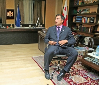 После того, как мы прошли проверку в ярко освещенном фойе, за нами спустился секретарь президента. Нам сказали, что интервью будет проходить в президентском конференц-зале. Комната была обставлена с экономной практичностью скандинавского толка; в ней не было эффектной декорации, которую можно было бы взять в кадр. Саакашвили сам предложил переместиться в его собственный кабинет, продемонстрировав понимание того, насколько важна презентация в непростом мире современных СМИ.