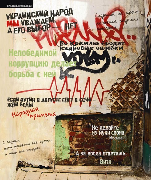 В России свободу всегда ставили к стенке - там она и прижилась. Заборы, двери, ворота гаражей - все это по сути оградительные форматы. Но в России, как раньше в СССР, они стали пространством свободы. В этом пространстве странным образом сочетаются ненормативная лексика и любовные признания, отношение к власти и учительнице химии. Выходящее в единственном числе, подобное средство информации тем не менее имеет массу читателей. The New Times решил издавать свой забор (дверь, ворота) - чтобы увеличитьпространство свободы.