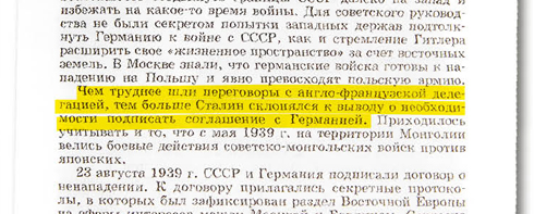 «Оценивая заключение пакта о ненападении с Германией, следует подчеркнуть, что альтернативой ему мог стать аналогичный пакт Германии с Англией, означавший, по сути, объединение Запада против СССР». Датировка цитаты заставит затрудниться даже сведущего человека, и многие наверняка признают в ней характерный советский стиль 1940-х годов. Между тем она извлечена из концепции учебника, который должен выйти из печати в России осенью 2009 года и даже претендует стать основным школьным пособием. «Большой стиль» снова в моде.