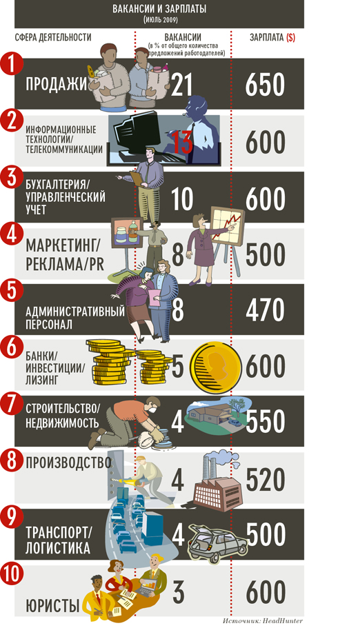 Умерить амбиции Именно завышенные зарплатные ожидания могут сыграть с нынешними выпускниками злую шутку. По данным HeadHunter, по сравнению с 2008 годом зарплаты резко (на 10–20%) снизились практически во всех секторах, особенно в сфере маркетинга, финансов и административного персонала, информационных технологий. К примеру, в IT-сфере предлагаемая новичкам зарплата упала с $800 до $600, в финансовой сфере — с $700 до $600, в маркетинге — с $600 до $500.