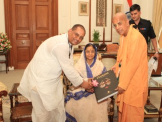 Вайшнавы преподнесли президенту Индии традиционные подарки: священную Бхагавад-гиту на русском языке, другие ценные книги, картины, особую длинную гирлянду из оранжевых, белых и зеленых цветов, символизирующую цвета национального индийского флага, а также знаменитый оренбургский пуховый платок. Сильное впечатление на госпожу Патил и на других собравшихся гостей произвела рецитация древних ведических гимнов самой маленькой участницей встречи, московской русской школьницей с индийским именем Шри Прия. Семилетняя девочка по памяти с легкостью воспроизвела длинные пассажи сложного размера на санскрите, удивив даже такого знатока, как президент Индии.