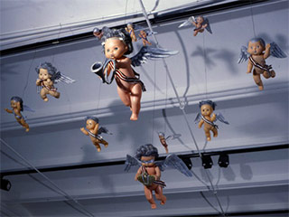 Вот гордо парят под потолком жутковатые резиновые куклы, переработанные Борисом Орловом в позитивных Купидонов с посеребренными крыльями, - кто с волосами, но без глаз, а кто наоборот. Все вместе они - "Парад астральных тел".