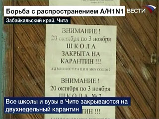 Первые случаи заболевания гриппом A/H1N1 в Чите выявлены 3 октября. С 5 по 11 октября эпидемический порог заболеваемости ОРВИ и гриппом в краевом центре был превышен на 11,2%, с 12 по 18 октября - в три раза. В этой связи власти города со вторника закрыли на двухнедельный карантин все школы.
