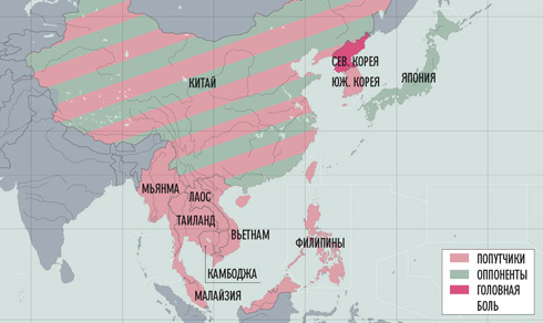 В этом регионе все затмевает Китай. Нет другой страны, с которой политические отношения России были бы настолько хороши, а потенциал для конфликтного пересечения экономических и даже стратегических интересов столь велик. Внешняя политика Пекина впечатляет невероятной последовательностью: ее задачей действительно является создание условий для внутреннего развития (доступ к ресурсам и обеспечение рынков сбыта), без всяких побочных амбиций. Но по степени целеустремленности КНР напоминает асфальтовый каток, с которым можно взаимодействовать, но практически нет шансов извне повлиять на его движение.