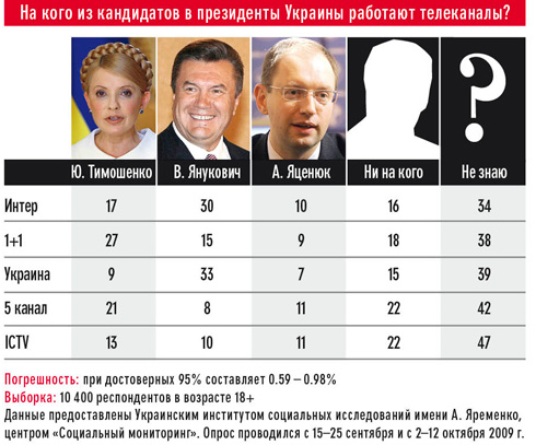 И все же переоценивать значение «ящика» в украинской президентской гонке не стоит. Основные конкуренты определены — Юлия Тимошенко и Виктор Янукович, и оба вниманием СМИ не обижены. Сложившаяся на украинском телевидении ситуация напоминает избитое выражение «хранить яйца в разных корзинах» — так в интервью The New Times прокомментировала работу каналов в предвыборный период главный редактор сайта www.telekritika.ua Наталья Лигачева. По мнению Лигачевой, информационный баланс суть свидетельство осторожности украинских олигархов — владельцев каналов. Бизнесмены стараются не увлекаться поддержкой одного кандидата: а вдруг фортуна на финише от него отвернется? В результате выиграют кандидаты второго эшелона (их зарегистрировано уже 9): исполняя роль то кордебалета при главных героях, то «сюрпризов из табакерки», то неожиданных и не указанных в программке номеров, они тоже получили доступ на главные телевизионные площадки страны.