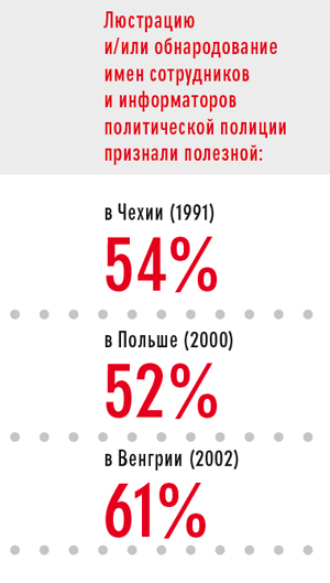 Очищение Собственно, ровно это еще со времен Древнего Рима и означает слово «люстрация». В странах, где были приняты соответствующие законы (в 1991 году — в Чехии, в 1994-м — в Венгрии, в 1997-м — в Польше), оно несло запрет занимать публичный или государственный офис, возглавлять государственные СМИ, предприятия, становиться судьями и т.д. тем, кто был офицером или агентом секретных служб. В Чехии было определено 9 тыс. таких постов, а через проверку за 10 лет прошли 400 тыс. человек (3% оказались «STB-положительными»). В Венгрии эти законы трижды менялись, и в конце концов было определено около 8 тыс. постов, которые финансировались из денег налогоплательщиков и которые не могли занимать бывшие сотрудники и информаторы политической полиции. В Польше сразу же, в 1990–1991 годах, начали с рентгена правоохранительной системы: специальные комиссии уволили 10% прокуроров и 33% сотрудников генеральной прокуратуры. Потом процесс остановился, но то и дело во времена избирательных кампаний всплывали досье то на одного политика, то на другого, третьего… В конце концов, зависимость от игр бывших сотрудников политической полиции и их коллег из Москвы надоела даже самым убежденным правозащитникам, и в июне 1997 года был принят люстрационный закон, запрещавший занимать выборные должности, работать в высшей бюрократии, в судах, в прокуратуре и в СМИ людям в погонах или сотрудничавших с ними. Потом этот закон был распространен и на адвокатов.