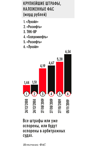 * * Исчисляются не с убытка государства за конкретное нарушение, а со всего оборота компании. И начиная со второй половины нынешнего года ФАС начала активно применять их в «нефтянке». 5 ноября рекордный штраф — 6,54 млрд рублей — был выписан компании «Лукойл». Да и вся первая шестерка крупнейших в истории России штрафов приходится на представителей этой отрасли. Правда, ни один из этих штрафных миллиардов в реальности так еще и не заплачен: холдинги оспаривают их в судах.