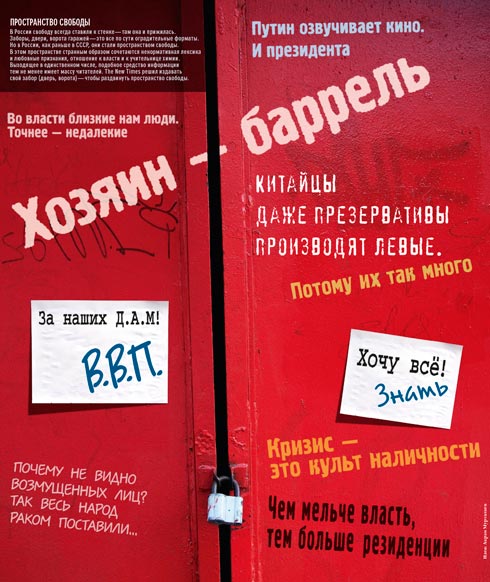 Солидарность грязных камер и грязных перьев В России свободу всегда ставили к стенке - там она и прижилась. Заборы, двери, ворота гаражей - все это по сути оградительные форматы. Но в России, как раньше в СССР, они стали пространством свободы. В этом пространстве странным образом сочетаются ненормативная лексика и любовные признания, отношение к власти и учительнице химии. Выходящее в единственном числе, подобное средство информации тем не менее имеет массу читателей. The New Times решил издавать свой забор (дверь, ворота) - чтобы увеличить