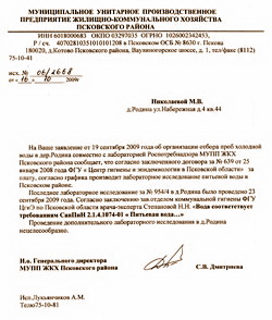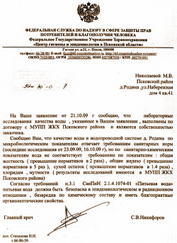 Ответ поступил г-же Николаевой почти через месяц. В письме от 16 октября 2009 года и. о. генерального директора МУПП ЖКХ Псковского района Светлана Дмитриева сообщала, что «ФГУ «Центр гигиены и эпидемиологии в Псковской области» за плату, согласно графика производит лабораторное исследование питьевой воды в Псковском районе. Последнее лабораторное исследование за № 954/4 в д. Родина было проведено 23 сентября 2009 года. Согласно заключению зав. отделом коммунальной гигиены ФГУ ЦгиЭ по Псковской области врача-эксперта Степановой Н. Н. «вода соответствует требованиям СанПиН 2.1.4.1074-01 «Питьевая вода».