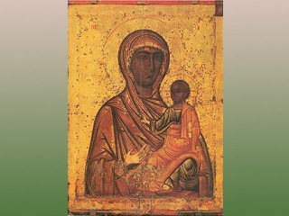 "Богоматерь Одигитрия", которую называют иногда "Эфесской", "Полоцкой", "Корсунской" или "Торопецкой" - одна из самых старых икон в собрании ГРМ. Ее появление относят к XII-XIV векам, иконы такого времени в музеях мира наперечет, отмечает "Коммерсант". Специалисты ГРМ считают, что древний образ XII века был некогда утрачен и в XIV заменен новым, написанным псковским мастером, что не делает икону менее уникальной.