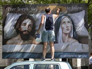 В новозеландском городе Окленд накануне Рождества разразился скандал. Возле здания "Прогрессивной англиканской церкви св. Матфея" вывесили огромный плакат, на котором были изображены лежащие под одним одеялом Мария и грустный Иосиф.
