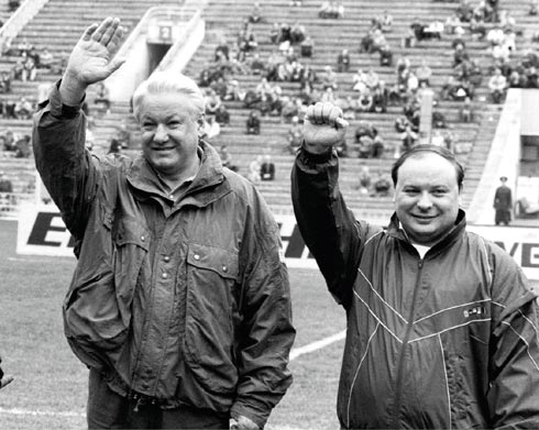 1992 г. Борис Ельцин и Егор Гайдар на матче между футбольными сборными правительств России и Москвы