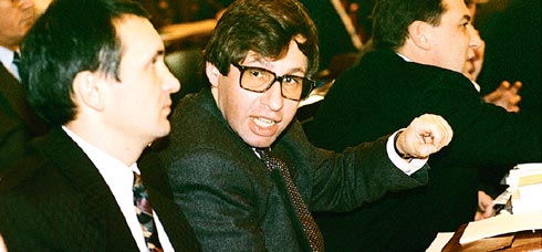 Апрель 1994 г.: депутаты Государственной думы России Егор Гайдар и Анатолий Чубайс что-то обсуждают с коллегами — депутатами Сергеем Ковалевым и Сергеем Юшенковым