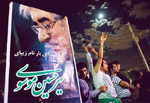 Два лагеря Вечером того же дня несколько тысяч молодых людей, обвязанных зелеными лентами, с портретами кандидата от реформистов Мир-Хоссейна Мусави собрались на площади Ванак в северной части Тегерана. «Махмуд, забирай свои бомбы и убирайся!», «Свободу Ирану!» скандировали они. Такого Тегеран не видел со времен исламской революции.