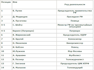 Далее места распределились так (в порядке убывания): глава МЧС Сергей Шойгу (рейтинг за год поднялся), патриарх Московский и всея Руси Кирилл (рейтинг вырос значительно, на 14%), лидер ЛДПР Владимир Жириновский (снизился), композитор Игорь Крутой (поднялся), кинорежиссер Никита Михалков (снизился), депутат Госдумы Иосиф Кобзон (снизился), мэр Москвы Юрий Лужков (снизился).