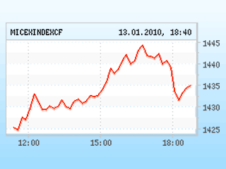 Индекс ММВБ сегодня к закрытию торгов повысился на 0,51% и составил 1435,01 пункта, что оказалось ближе к верхней границе диапазона сегодняшних торгов. В течение же сегодняшней торговой сессии индекс ММВБ понижался примерно до 1413 пунктов и повышался примерно до 1444 пунктов.