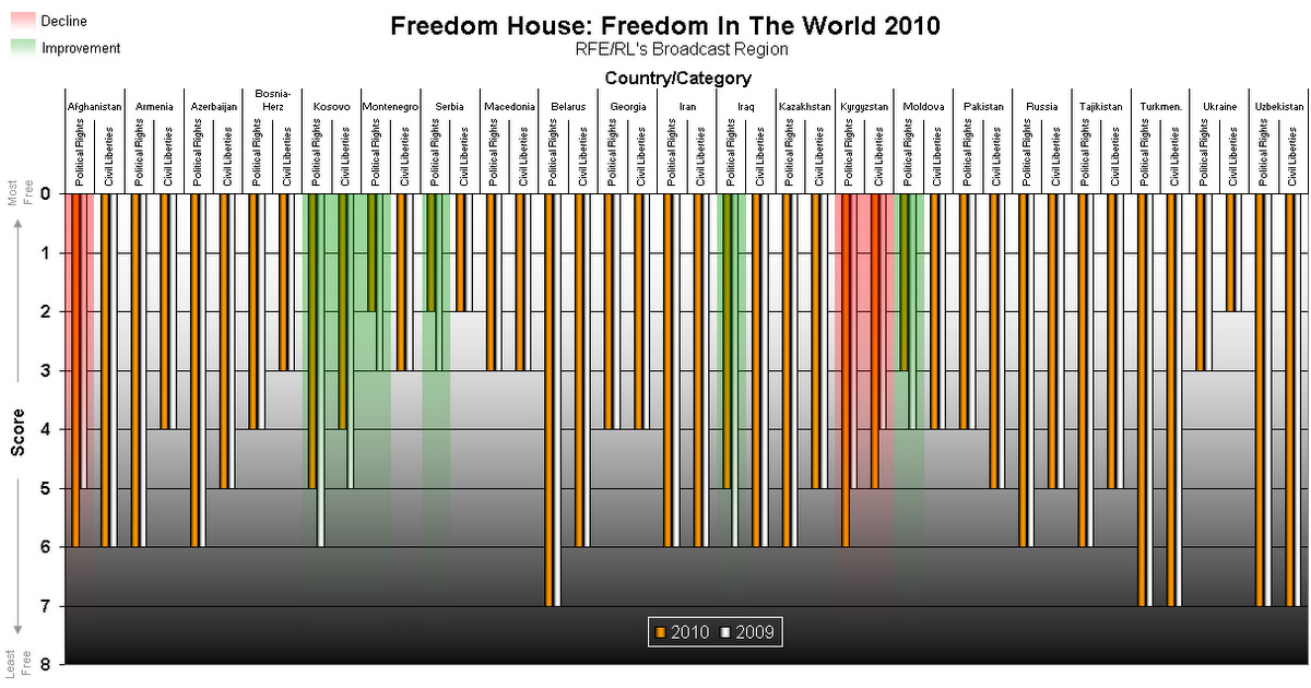 В отчете "Свобода в мире – 2010" собраны данные за 2009 год, который отмечен ростом репрессий против активистов правозащитного движения и движения за гражданские свободы. Ухудшение ситуации зарегистрировано в 40 государствах Ближнего Востока, Латинской Америки, Африки и в странах, входивших в состав Советского Союза. В этой группе государств проживают 20% населения земного шара.