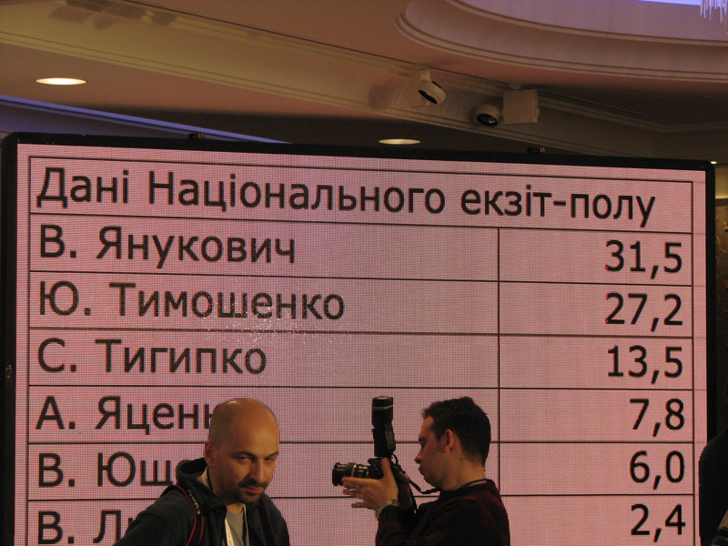 Как показывают экспресс-опросы на выходе с избирательных участков, которые проводили несколько социологических компаний, никто из кандидатов в президенты Украины не смог набрать необходимые для победы более пятидесяти процентов голосов избирателей. По данным национального exit-полла, организованного Фондом "Демократические инициативы", Центром Александра Разумкова и Киевским международным институтом социологии, у лидера оппозиционной Партии регионов Виктор Януковича – около 32 процентов, а у премьер-министр Юлии Тимошенко - более 27 процентов. Такой разрыв, по мнению экспертов, не критичен для Тимошенко и она сохранит шансы на победу во втором туре. Третьим на этих выборов социологи называют банкира Сергея Тигипко, вдвое уступившего главе правительства, и только пятым - с шестью процентами голосов - действующего президента Виктора Ющенко.