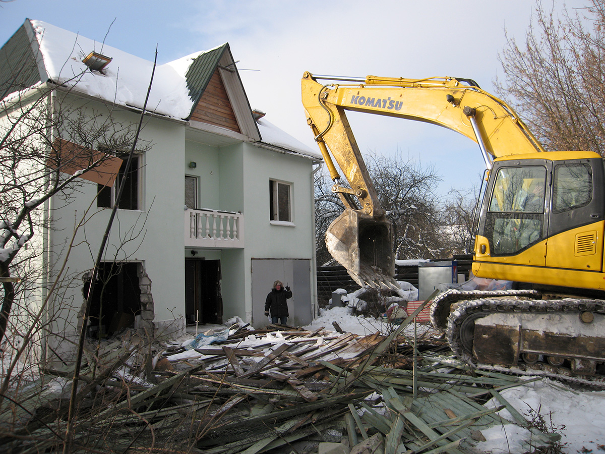 На улице стоит 20-градусный мороз, утром были все 25 градусов. Жители поселка и многочисленные журналисты пытаются отогреваться в машинах. Если появляется возможность, некоторые добираются до оперативного штаба, где обычно заседает правление "Речника" - там можно попить чаю и кофе. Но основные события происходят за оцеплением. Снос дома, расположенного на 10-м участке, начался в полдень. С утра все подъезды к этому коттеджу были заблокированы милицией, и журналисты никак не могли подступиться к этому строению. Но когда ковш экскаватора зацепил крышу здания, милиция пропустила корреспондентов к месту события. Хозяйка дома Людмила Роман в этот момент молча наблюдала за тем, как рушится на ее глазах жилье. Корреспондент РС спросил ее, что предпринималось для того, чтобы не допустить разрушения дома.