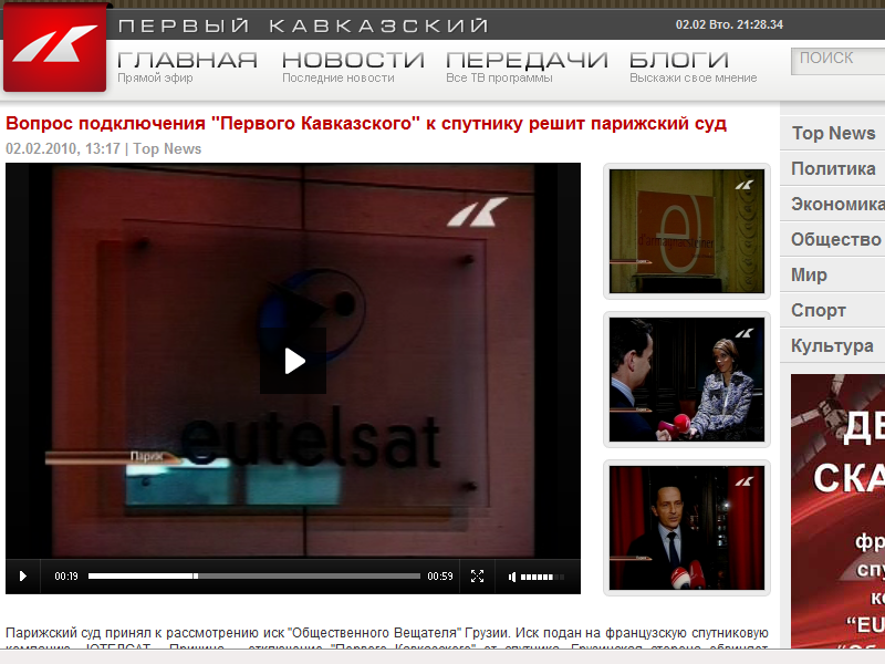 Дирекция канала и руководство спутникового оператора по-разному объясняют остановку вещания. На "Первом кавказском" полагают: дело в том, что Кремлю не понравилось содержание, поэтому компания "Газпром-медиа" якобы выкупила у Eutelsat транспондеры (передатчики), которые предназначались для "Первого кавказского". При этом договор между грузинским каналом и французским спутниковым оператором подписала только грузинская сторона.