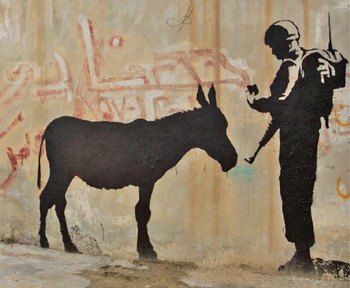 Кроме остросоциальных сюжетов (израильский солдат проверяет документы у осла; девочка обыскивает солдата), Бэнкси часто рисует на стенах своего любимого персонажа — крысу, «символ урбанистического одиночества»