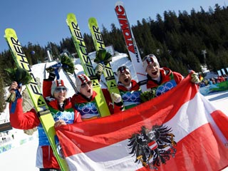 Сборная Австрии по прыжкам на лыжах с трамплина в составе Вольфганга Лойцля, Андреаса Кофлера, Томаса Моргенштерна и Грегора Шлиренцауэра стала олимпийским чемпионом в командных соревнованиях с преимуществом над ближайшим соперником в 72 балла.
