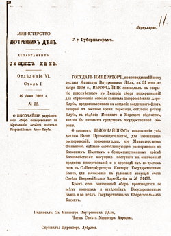 «Исполняя Высочайшую Его Императорского Величества Государя Императора волю, Отдел Воздушного Флота, подробные данные устройства которого были утверждены Общим Собранием Особого Комитета в заседании 6 марта 1910 г., имея в своем распоряжении заранее собранные материалы и сведения о положении воздухоплавательного дела за границей, немедленно приступил к осуществлению возложенной на него задачи: скорейшему созданию воздушного флота, путем: