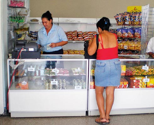 В большом универсаме под названием «Конец века», явно не видевшем ремонта с 70-х годов, в глаза бросаются пустые почерневшие от времени прилавки. В трикотажном отделе одиноко висят на вешалке мужская рубашка и брюки, по виду вышедшие из моды задолго до конца прошлого века, сиротливо стоит пара китайских сандалий из кожзаменителя. На прилавках отдела бытовой техники три вида электрических лампочек, различные переходники, адаптеры, старинные трехдюймовые дискеты и почему-то восковые свечи. На улице около универсама — грязный покосившийся прилавок с нарисованной румяной свиньей и надписью «Продукты высокого качества». Единственный товар — несколько бумажных кулечков с жареной свиной кожей. Спрашиваю для интереса: а есть ли, собственно, свинина? Поначалу продавец, не глядя, лениво бормочет, что утром была, да вся вышла, только завтра, может быть, привезут с продуктовой базы. Наконец, обернувшись на акцент и признав иностранца, оживляется: вообще-то он мог бы за конвертируемые песо уступить мне килограмм вырезки, припасенной для себя.