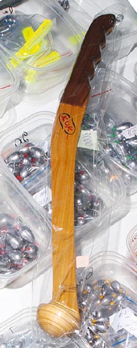 | А вот эта очень интересная штука для ловли сома называется «квок». «Пяточкой» — она бывает очень разных форм — бьют по воде, и она издает такой звук — квок! Это приманивает сома. Почему — никто не знает |