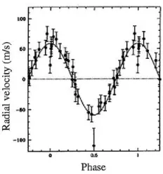 К 1995 г. в поиске экзопланет лидировали две конкурирующие группы: Мишель Майор, Дидье Келос (Женевский университет) и Джеф Марси, Пол Батлер (Университет Беркли, США). Первыми оказались швейцарцы. Историю открытия, излагаемую ниже, я почерпнул в основном из доклада Джефа Марси. К осени 1995 г. обе группы имели работающую методику и вели систематический поиск. По словам Марси, их точность была лучше: именно они придумали ячейку с парами йода. Швейцарцы, впрочем, использовали похожую методику. Как бы то ни было, 6 октября швейцарцы увидели периодические колебания лучевой скорости звезды 51 Пегаса, причем с огромной амплитудой — 60 м/с и очень коротким периодом — 4,2 дня. Такого никто не ожидал! Джеф Марси утверждает, что им просто не повезло: в каталоге, которым они пользовались, 51 Пегаса ошибочно значилась, как вспыхивающая звезда, и они исключили ее из списка целей. Вероятно, это был действительно предмет везения, поскольку уже через 2 недели Марси с Батлером подтвердили открытие, причем с лучшей точностью.