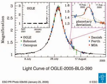 Несколько более экзотический метод — гравитационное микролинзирование. Это хорошо известный эффект, используемый для поиска объектов, невидимых в телескоп. Когда тяготеющее тело и более далекая звезда оказываются на одном луче зрения, наблюдаемая яркость этой звезды многократно возрастает. Линзой может быть и обыкновенная звезда. Поскольку все звезды движутся, возрастание блеска длится относительно недолго, например несколько недель. Если у звезды-линзы нет планет, кривая блеска линзируемой звезды опишет симметричный пик. Если есть планеты, линза искажается, причем так, что появляются небольшие области дополнительного усиления, каустики. Если далекая звезда проходит очень близко к каустике планеты, на склоне пика появляется дополнительный острый пичок. Потом звезды расходятся, и событие не повторяется: следить за звездой в надежде увидеть новое событие микролинзирования бесполезно из-за ничтожной вероятности. Это недостаток метода. Но есть и достоинства. Во-первых, микролинзирование позволяет найти достаточно далекие от звезды и сравнительно небольшие планеты, которые не отлавливаются другими методами. Во-вторых, все вероятности хорошо считаются. Если проводить систематический обзор неба на предмет микролинзировния, то известна вероятность найти планету данного типа, А это значит, что по найденным планетам, пусть и небольшому числу, можно восстановить их реальную распространенность. Сейчас методом микролинзирования найдено около 10 планет, причем они попадают в область, не покрываемую другими методами. В частности, найдена планета порядка 5 земных масс, находящаяся по отношению к своей звезде где-то между нашими Марсом и Юпитером.