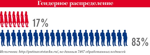 Гендерное распределение голосов также соответствует канонам политической науки для патриархальных обществ: среди оппонентов премьера Путина абсолютное большинство мужчин — 83%. Похожие цифры можно было получить в мусульманских странах, где тоже господствует мужской шовинизм, а место женщины — на кухне и в постели. Отдельного анализа требует определение, откуда пришли 17% «женских» подписей — скорее всего их дали более модернизированные столицы, где у женщин больший доступ и к рабочим местам с приличными зарплатами, и к образованию.