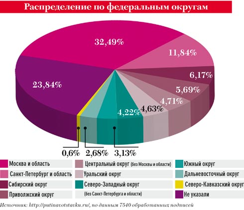 Наиболее активны столицы — Москва дала чуть меньше трети всех подписей (28,79% плюс 3,7% — жители Подмосковья), Санкт-Петербург — 11,3% (Ленинградская область — чуть более половины процента).