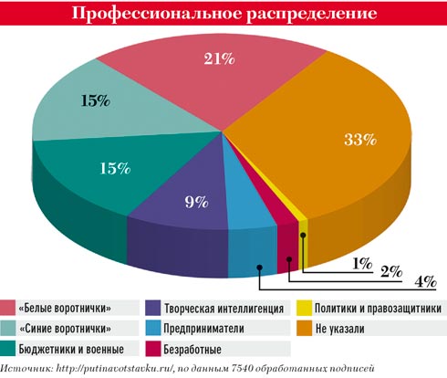 Возрастающий объем подписей потребовал очертить группы по типу деятельности, а не по конкретным профессиям. В абсолютные лидеры вышли «белые воротнички» (юристы, экономисты, IT-специалисты, менеджеры) — среди тех, кто требует отставки Путина, их пятая часть — 21%. Представители творческой интеллигенции (ученые, журналисты, писатели), которые лидировали по результатам первой недели онлайнового протеста, сейчас лишь на 4-м месте (9%), в то время как существенно увеличилось среди подписавших обращение число «синих воротничков», бюджетников и пенсионеров (в сумме они дали 30%). Ну а оппозиционные политики и правозащитники, которых в стране мало, и вовсе скатились в нашем анализе на последнее место — 1%, безработных среди протестующих оказалось в два раза больше. The New Times продолжит свои социологические упражнения и в следующих номерах познакомит с ними читателей.