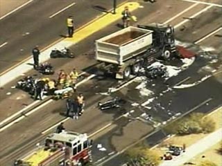 Как сообщил представитель полиции Финикса Луис Самудио, ЧП произошло в четверг после обеда по местному времени. Самосвал врезался в ожидавшую "зеленого света" группу из восьми мотоциклов, на которых было не менее девяти человек.