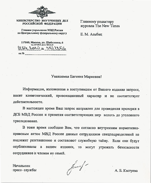 | The New Times обратился в Главное управление МВД по Центральному федеральному округу за комментариями. Там журналистам сообщили, что полковник Д. в данный момент находится в отпуске и он не уполномочен общаться с прессой. Как и подполковник О. «Вы называете фамилии, которые не подлежат общественному разглашению», — заявила The New Times начальник пресс-службы ГУ МВД по ЦФО Анжела Кастуева и предложила направить запрос на имя начальника ГУ МВД ПО ЦФО Валерия Кожокаря. Соответствующий запрос был отправлен 31 марта, а уже на следующий день в редакцию поступил ответ: |