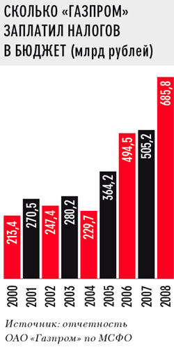 В 2008 году «Газпром» перечислил в бюджет 685,8 млрд рублей: налоговые отчисления составили всего 19% от выручки.* *Официальная отчетность за 2009 год еще не обнародована. А нефтяная компания «ЛУКОЙЛ» отдала государству 56% своих доходов. В 2007 году «Газпром» заплатил в бюджет $7,3 с барреля добытых нефти и газа — против почти $40, уплаченных крупнейшими отечественными нефтяными компаниями. Причины столь низкой отдачи стоит поискать в прошлом газового монстра.