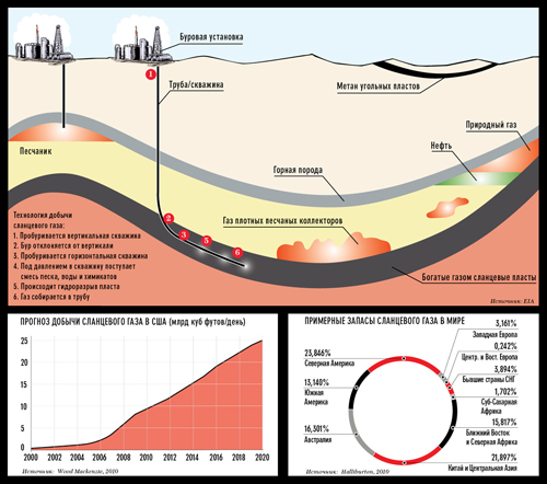 «Высокие цены на газ сделали добычу сланцевого газа экономически целесообразным предприятием, — пояснил гендиректор консалтинговой компании East European Gas Analysis Михаил Корчемкин. — Соединенные Штаты всего за несколько лет усовершенствовали технологию вертикального бурения, за счет которой добывается ресурс, и ранее считавшиеся малоперспективными месторождения сланцевого газа превратились в коммерчески привлекательные активы».