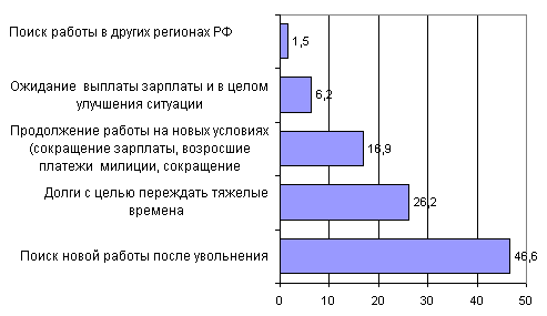 Даже если не принимать во внимание дискриминационный подход к работникам-мигрантам со стороны работодателей, проявляющийся при сокращении штатов, мигранты сильнее местных работников страдают от кризиса. Они особенно сильно представлены в таких отраслях, которые сильнее реагируют на изменения экономической конъюнктуры, такие как строительство, обрабатывающая промышленность и торговля. Полученные данные коррелируют с результатами исследований поведения предприятий России в условиях кризиса. Так, согласно обследованию, проведенному ГУ-ВШЭ совместно с «Левада-центром», предприятия, сталкиваясь с серьезными экономическими трудностями, предпринимают следующие меры: сокращение численности персонала (40% предприятий), сокращение рабочего времени (46%), снижение основной заработной платы (39%). Согласно выводам авторов исследования, эти меры, предпринимаемые предприятиями в рамках адаптации к снижению деловой активности, способствуют стабилизации занятости и сдерживанию роста безработицы в России [11].