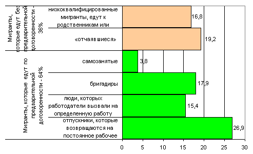 Прежде всего, в миграционном потоке, направляющемся в Россию, преобладают взрослые люди, владеющие несколькими рабочими профессиями, имеющие большой опыт работы, многолетний опыт миграции, гарантированное трудоустройство в России. Об этом говорит следующее: