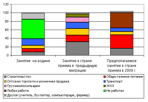 Еще более разительной является разница между возвращающимися и отправляющимися мигрантами по уровню доходов. Возвращенцы значительно более богаты, чем те, кто поехали работать в Россию в разгар кризиса: среди отъезжающих мигрантов в 3 раза меньше людей с высокими доходами и почти в 4 раза больше людей с очень низкими доходами, чем среди возвращенцев. Поэтому можно сделать вывод, что в кризисное время на заработки едут опытные мигранты с большим профессиональным и житейским опытом, с обширными связями в мигрантских сетях. Кроме того, подавляющее большинство — члены мигрантских домохозяйств, потерявших доходы и сбережения в ходе кризиса. Таким образом, в пик кризиса продолжают мигрировать «профессиональные» мигранты, полностью зависящие от мигрантских доходов.