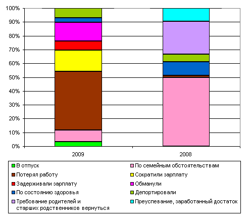 Сезонное возвращение мигрантов не закончилось в декабре, как обычно. Кризис вызвал волну возвратной миграции, которая последовала за периодом увольнений и сокращений персонала в России в декабре 2008 года [7]. Возвратная миграция продолжалась вплоть до конца апреля 2009 года и на месяц задержала выезд сезонников в Россию. Они отслеживали ситуацию и отправились на заработки только в последних числах февраля 2009 года. Сезонный отъезд на работу растянулся на несколько месяцев — вплоть до июня. При этом число сезонников было на 35-40% меньше, чем годом раньше.