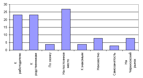 Поиск работы осуществлялся в основном через сети — через друзей и родственников — 29%, через знакомых — 29%. Мигранты активно перезваниваются, выясняя возможности для трудоустройства в других регионах. К объявлениям в СМИ обращались 25,8% респондентов, и к Интернету — почти 10%. Период времени поиска работы или ожидания для таджикских мигрантов довольно короткий, что связано с ограниченностью их финансовых ресурсов: 40% искали работу перед возвращением в течение 1 месяца, 30% — в течение 2-х месяцев, еще 30% — более 2-х месяцев.
