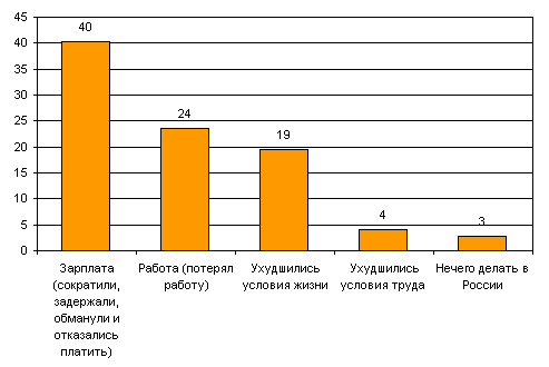 Задержки зарплаты, наиболее значительные в строительной отрасли, начались с октября 2008 года. В целом 57,2% респондентов сообщили, что им задерживали зарплату от 2 до 5 месяцев. При этом 13,6% мигрантов считают, что им не выплатят заработанное, и квалифицируют поведение работодателей как обман.