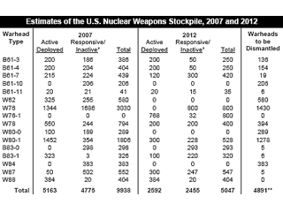 Согласно этим данным, "по сравнению с концом 1967 финансового года, когда США располагали 31255 зарядами, нынешний арсенал сократился на 84%, в сравнении с уровнем конца 1989 года, когда пала Берлинская стена, - на более чем 75%". "С 1994 по 2009 финансовый год США демонтировали 8748 ядерных боеголовок, - указывается в справке. - Еще несколько тысяч боеголовок ожидают сейчас на складах демонтажа. Количество нестратегических ядерных боеголовок сократилось с 30 сентября 1991 года по 30 сентября 2009 года примерно на 90%".