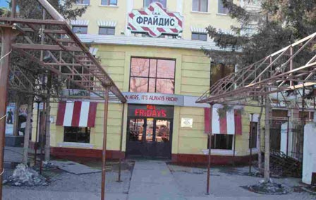 Рядом с ним располагается кафе, входящее в сеть «Фрайдис». Жизнеутверждающий лозунг “In here, its always Friday” мне почему-то напомнил выражение «у них семь пятниц на неделе».
