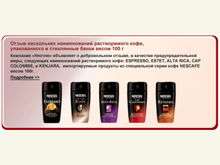 Эта мера касается растворимого кофе Alta Rica, Cap Colombie, Estet, Kenjara и Espresso. Это импортируемые в Россию продукты из специальной серии кофе Nescafe весом 100 граммов, которые упаковываются в стеклянные банки особого типа, покрытые пластиковой оболочкой, сообщают "Вести.ru".