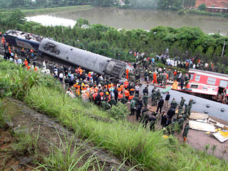 Десятки пассажиров как поезда, так и автобуса получили ранения, некоторые из них находятся в тяжелом состоянии. Как передает китайское информационное агентство Синьхуа, министр железнодорожного транспорта Китая сообщил, что поезд был сметен с рельсов сошедшим оползнем в гористом районе провинции Цзянси.